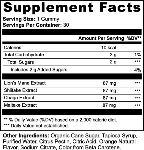 Lion's Mane Extract (87 mg), Shiitake Extract (87 mg), Chaga Extract (87 mg), Maitake Extract (87 mg), Organic Cane Sugar, Tapioca Syrup, Purified Water, Citrus Pectin, Citric Acid, Orange Natural Flavor, Sodium Citrate, Color from Beta Carotene.